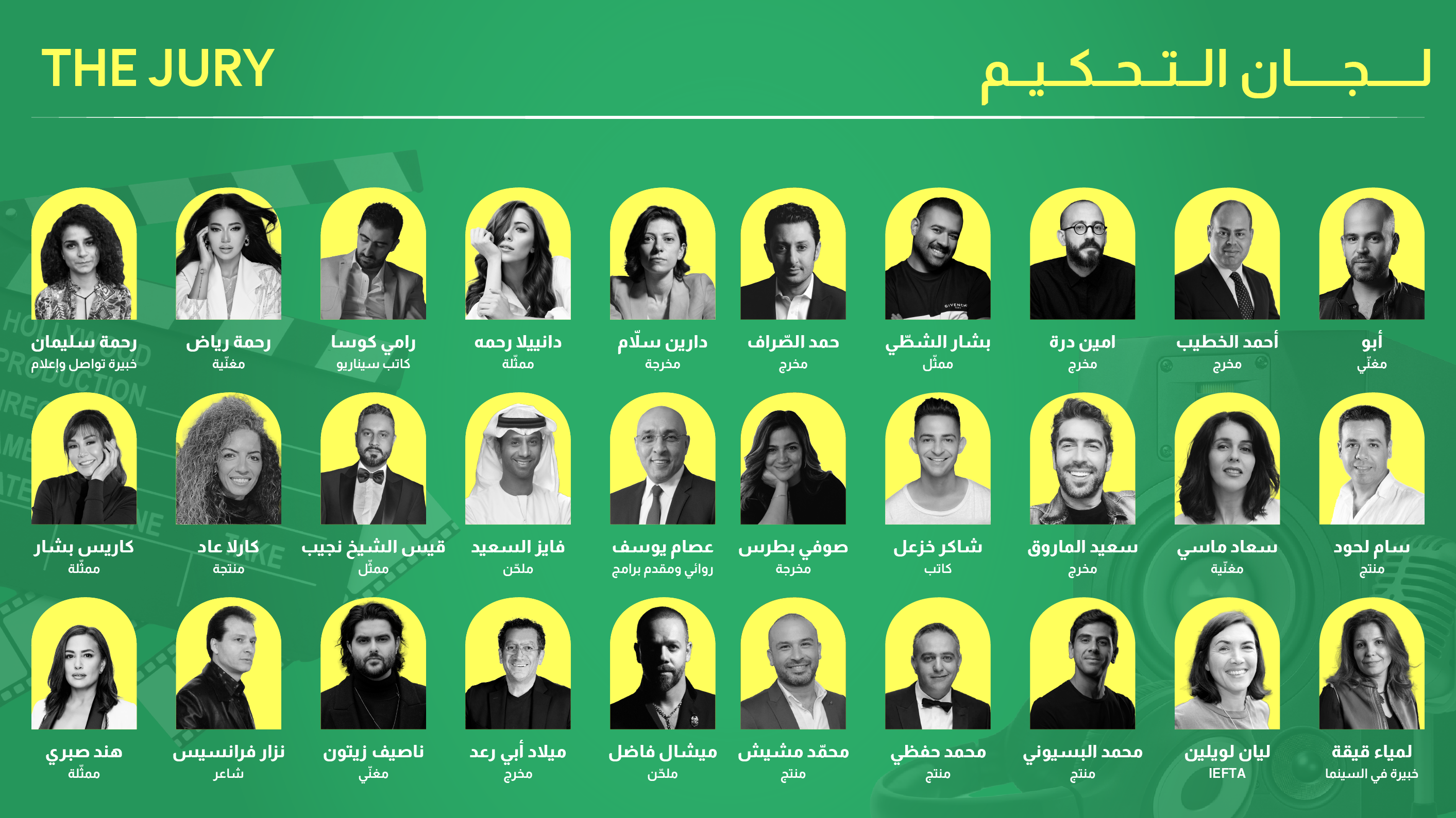 The competition jury includes esteemed artists, celebrities and industry professionals respectively as follow: Abu, Ahmad Al Khatib, Amin Dora, Bashar Al-Shatti, Carla Aad, Chaker Khazaal, Daniella Rahmeh, Darin Sallam, Essam Youssef, Fayez Al Saeed, Hamad Alsarraf, Hend Sabri, Karess Bashar, Lamia Guiga, Lianne Llewellyn, Michel Fadel, Milad Abi Raad, Mohamed El-Bassiouni, Mohamed Hefzi, Mohammad Mashish, Nassif Zeytoun, Nizar Francis, Qays Sheikh Najib, Rahma Riad, Rahma Soliman, Ramy Koussa, Said El Marouk, Sam Lahoud, Sophie Boutros, and Souad Massi.